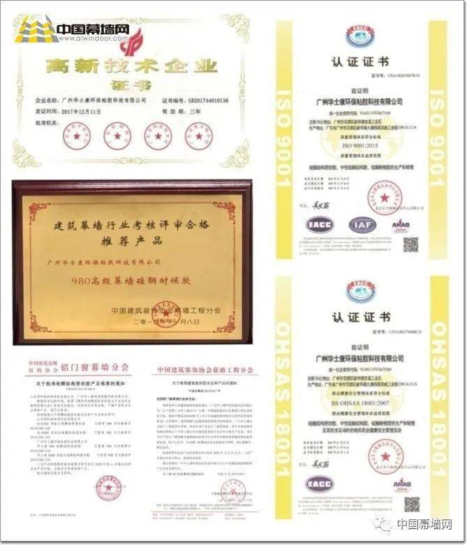 多年的踔厉奋发、笃行不怠,华士康赢得了工作表里的各项荣誉,其中有“修建用硅酮密封胶出产引荐企业”荣誉称号、“广东省高新技术企业”荣誉,并经过ISO9001质量管理体系认证及18001工作健康安全管理体系认证。